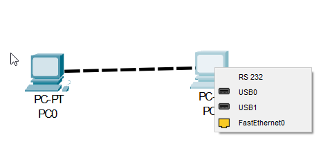 두 대의 컴퓨터를 크로스 케이블(검정색 점선)로 연결한다.