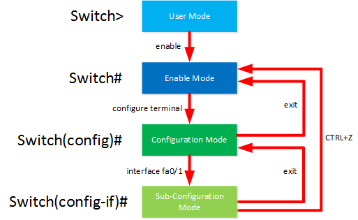 Cisco IOS를 익힐때 제일 먼저 이해하여야 하는 것은 IOS가 가지는 모드 개념이다. Cisco IOS 명령어는, 그 명령어에 적합한 모드에서만 오류없이 실행이 가능하다. 맞지 않는 모드에서 명령어를 입력하면 오류가 발생한다.