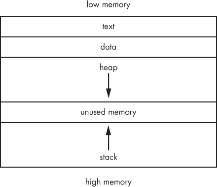 텍스트Text 세그먼트에는 실행될 프로그램 코드가 포함되고, 데이터Data 세그먼트 에는 프로그램에 대한 전역 정보가 포함됩니다. 더 높은 주소에는 런타임에 할당되는 스택과 힙이 공유하는 부분이 있습니다. 스택 은 크기가 고정되어 있으며 함수 인수, 지역 변수 등을 저장하는 데 사용됩니다. 힙Heap은 동적 변수를 보유합니다. 더 많은 함수나 서브루틴이 호출될수록 스택의 소비는 증가하고, 더 많은 데이터가 스택에 저장될수록 스택의 상단은 더 낮은 메모리 주소를 가리킵니다.