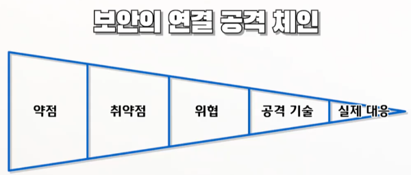 - 존재하는 약점 중 공격 가능한 취약점을 분류하여, 위협요소로 만들어 공격 기술로 발전시키고, 이를 이용한 공격에 대한 보안 전문가들의 실제 대응을 통해 공격을 제거/차단하는 일련의 과정