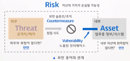 - 위험 : 외부의 행위로 인해서 자산에 대해 발생할 수 있는 손실